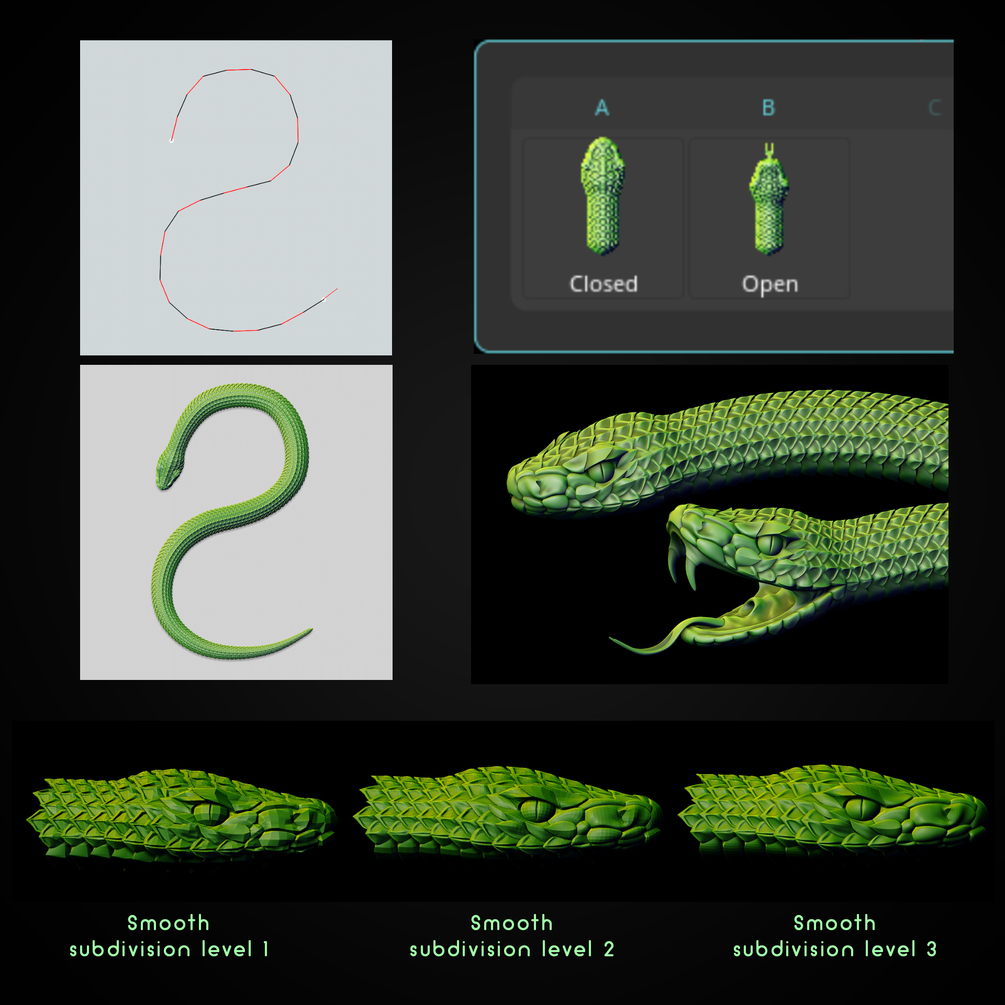 There is one peculiarity: you can add actual levels of subdivision (Tool>Geometry>Divide) only after separating the snake into a separate subtool, if this is not done the partitioning will not be smoothed!