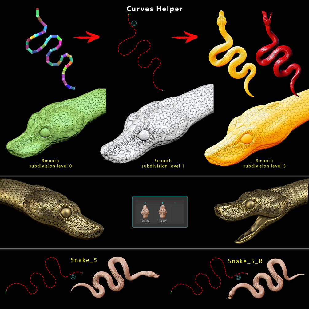 There is one peculiarity: you can add actual levels of subdivision (Tool>Geometry>Divide) only after separating the snake into a separate subtool, if this is not done the partitioning will not be smoothed!
